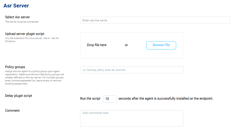 Make sure the policy groups are already defined on the Agent server. For multiple groups,s enter a comma-separated list, leave empty to remove the existing assignment. - Delay plugin script: How long to wait after starting a newly-deployed managed agent before activating the plugin script. Make sure to allow enough time for the necessary initial managed agent events to take place.