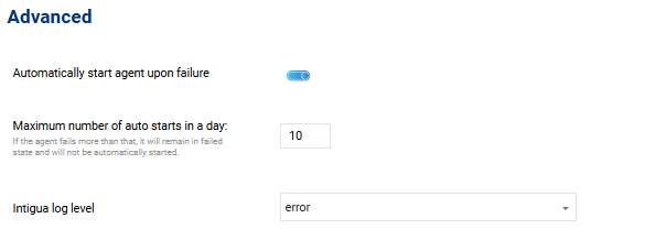 - Maximum number of auto starts in a day: If the agent fails, it will continue to automatically start for the number of times that is defined here. After reaching the number defined, it will remain in failed status.