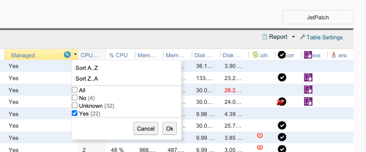 Managed Servers includes endpoints to which the JetPatch Connector has been deployed. This is the license count number. To verify which devices have licenses, go to the "Servers" tab and add the "Managed" column from Table Settings and then filter on "Managed = Yes". Then, you can download the Report from there