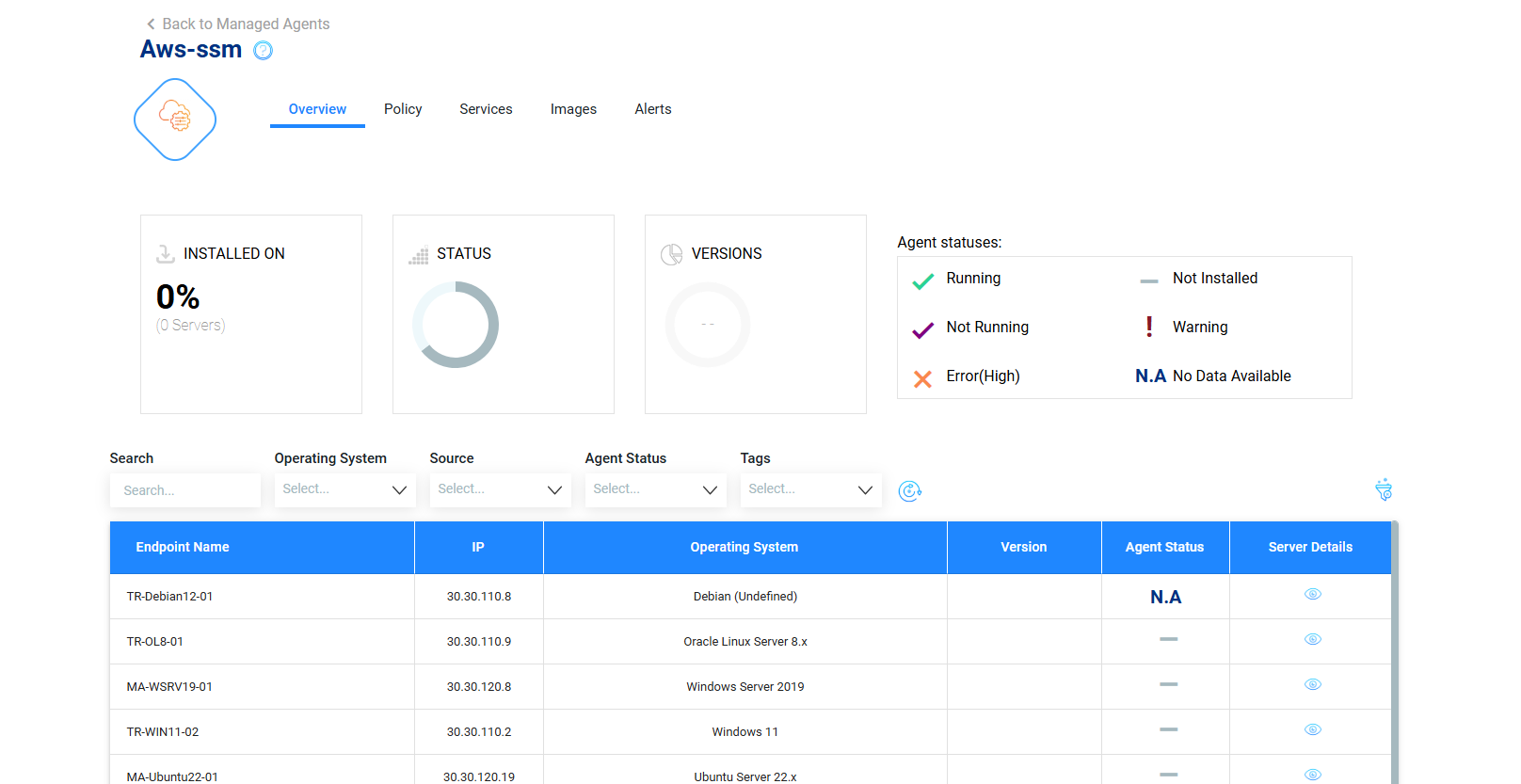 Here you can get an updated view of Agents' status and the servers it is installed on.