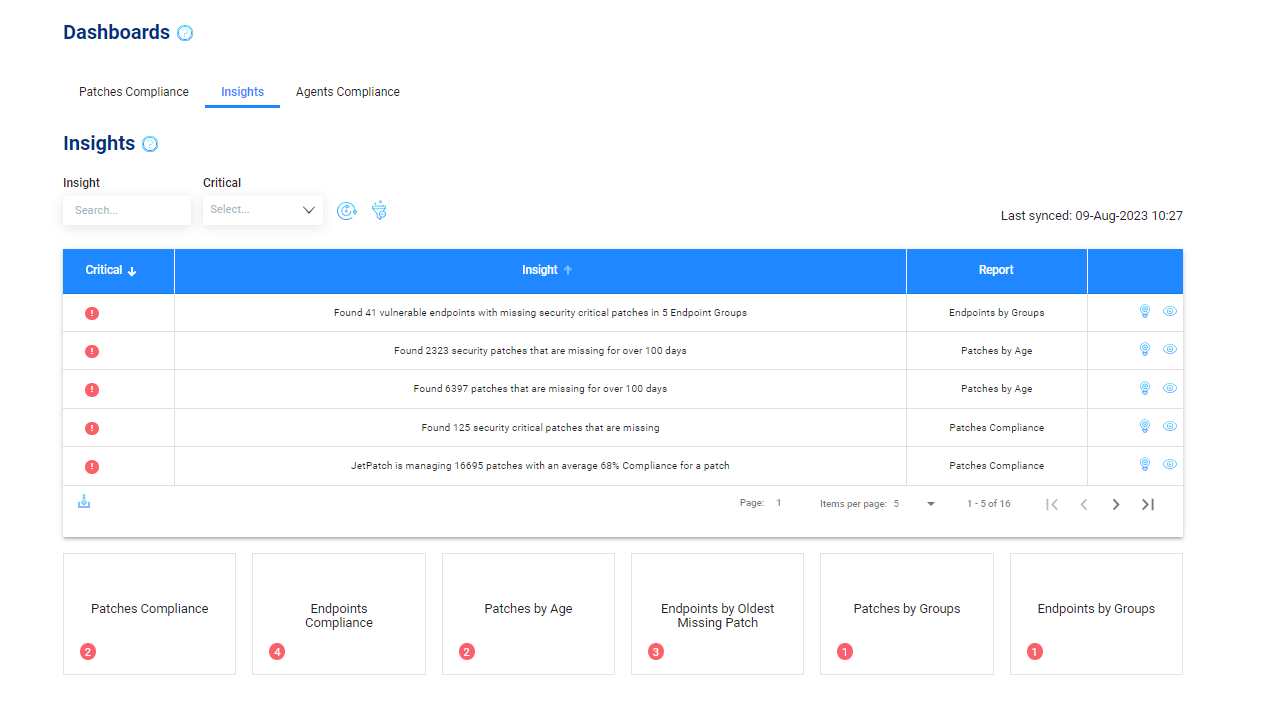 Access reports from the insights dashboard by clicking on the required report below the insights table. JetPatch insights are divided into six main reports: